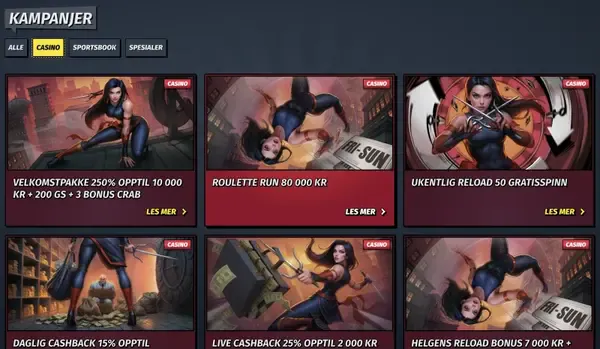 For sportsbook-spillere holder vi kampanjer adskilt, slik at du kan følge riktige regler for spill og odds. Våre ukentlige sportstilbud er laget for faste bettors som foretrekker tydelige grenser og forutsigbar timing. Du vil alltid se gjeldende krav inne i sportsbookens kampanjeområde før du godtar et tilbud.