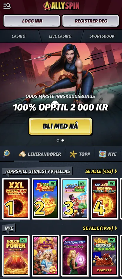 Bonuser er også tilgjengelige på mobil, og vilkår vises før du velger å delta. Vår Casino Welcome Package er totalt 250% (100%, 75%, 75%) opptil 10 000 NOK/€1 000 pluss 200 free spins, med 200 NOK/€20 i minimumsinnskudd og omsetningskrav på 35x (innskudd + bonus) og 40x free spins. Vi kjører også Weekly Reload free spins, en Weekend Reload Bonus på 50% opptil 7 000 NOK/€700 pluss 50 free spins, og Weekly Cashback opptil 15% tilbake opptil 30 000 NOK/€3 000, så valgene dine for Allyspin bonus kan endre seg gjennom uken.